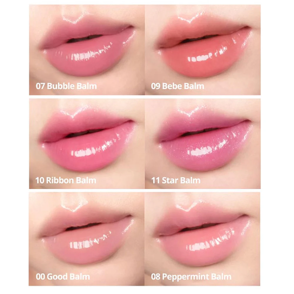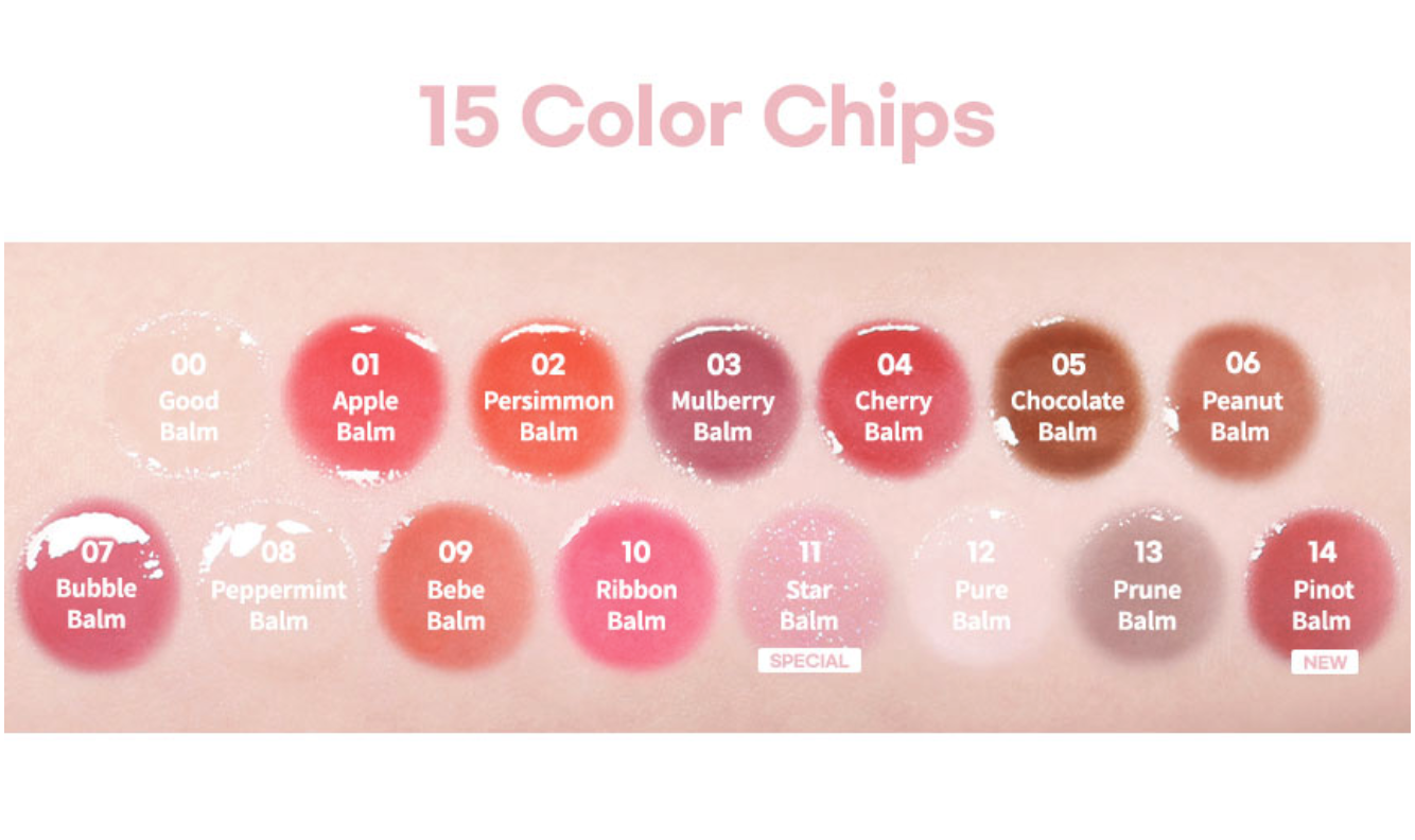 01 Apple Balm, 02 Persimmon Balm, 03 Mulberry Balm, 04 Cherry Balm, 06 Peanut Balm, 07 Bubble Balm, 09 Bebe Balm