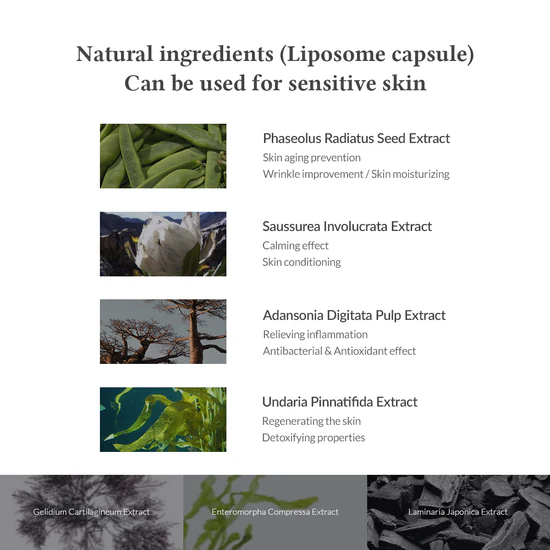 Water (Aqua); Glycerin; 1,2‑Hexanediol; Butylene Glycol; Phenoxyethanol; Arctium Lappa Root Extract; Chrysanthemum Sinense Flower Extract; Codonopsis Lanceolata Root Extract; Hovenia Dulcis Fruit Extract; Magnolia Kobus Branch/Flower/Leaf Extract; Salix Alba Bark Extract; Schisandra Chinensis Fruit Extract; Hamamelis Virginiana (Witch Hazel) Extract; Polyglyceryl‑10 Isostearate; Hydrogenated Lecithin; PEG‑40 Hydrogenated Castor Oil; Potassium Hydroxide; Polyglyceryl‑10 Oleate; Mentha Piperita (Peppermint) Extract; Phytosterols; Illicium Verum (Anise) Fruit Extract; Eucalyptus Globulus Leaf Oil; Sodium Gluconate; Mentha Piperita Oil; Panthenol; Scutellaria Baicalensis Root Extract; Ascophyllum Nodosum Extract; Dipotassium Glycyrrhizate; Epilobium Angustifolium Flower/Leaf/Stem Extract; Portulaca Oleracea Extract; Phaseolus Radiatus Seed Extract; Enteromorpha Compressa Extract; Gelidium Cartilagineum Extract; Undaria Pinnatifida Extract; Laminaria Japonica Extract; Adansonia Digitata Pulp Extract; Saussurea Involucrata Extract