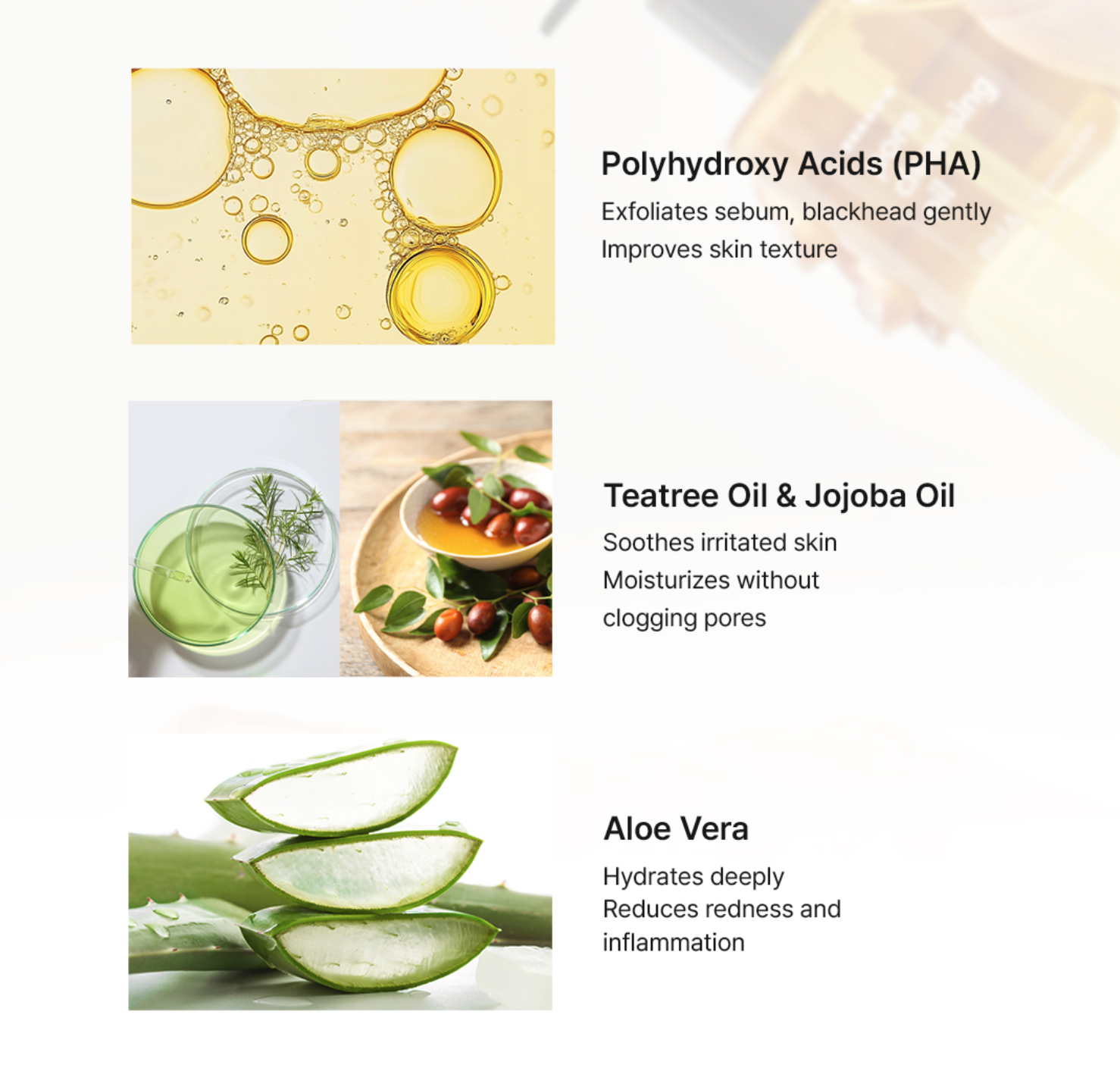 A gentle cleansing oil with PHA (polyhydroxy acid) that melts makeup, clears pores, and lightly exfoliates while preserving skin balance.