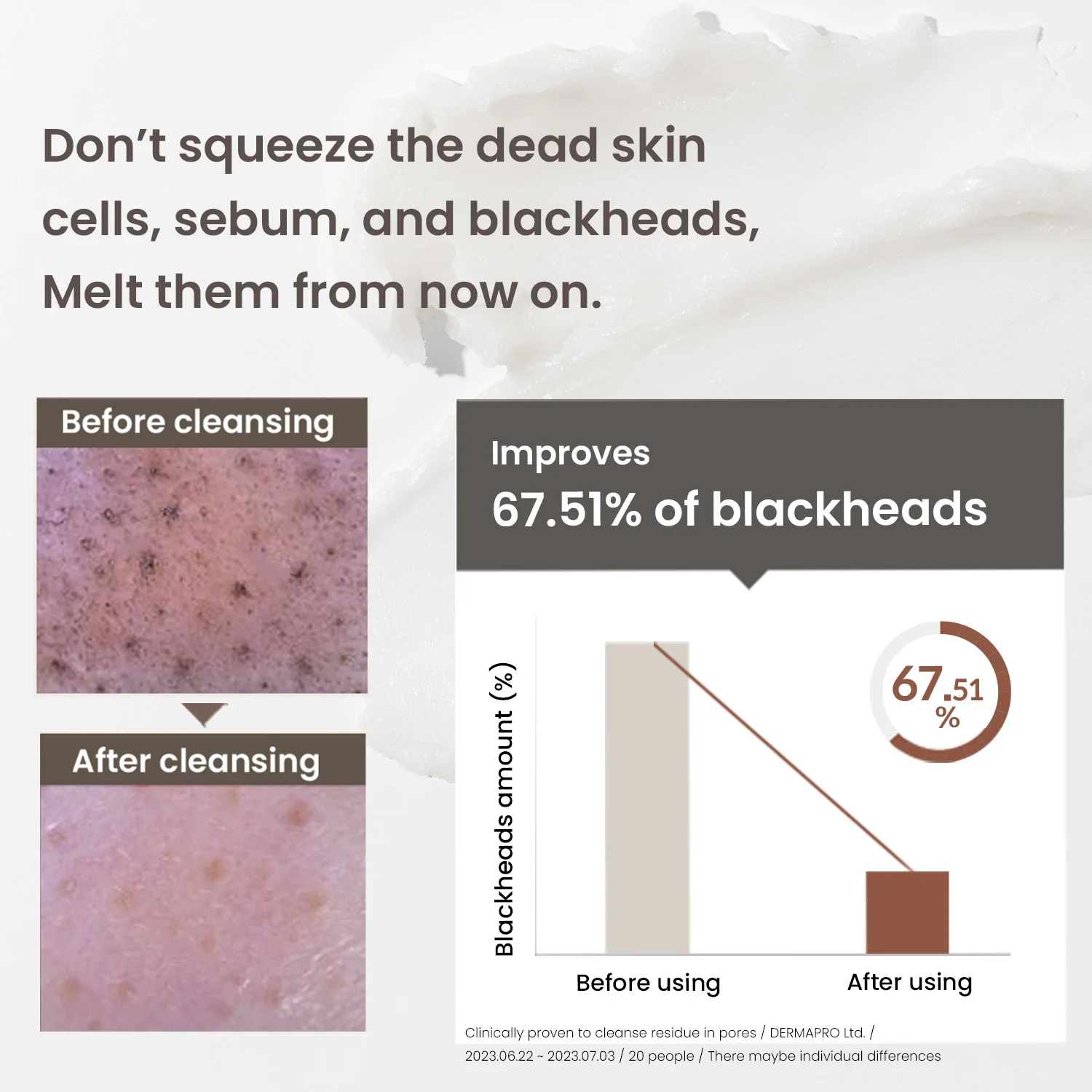 2. Apply onto dry skin and gently massage over face and lips to dissolve makeup and sunscreen.