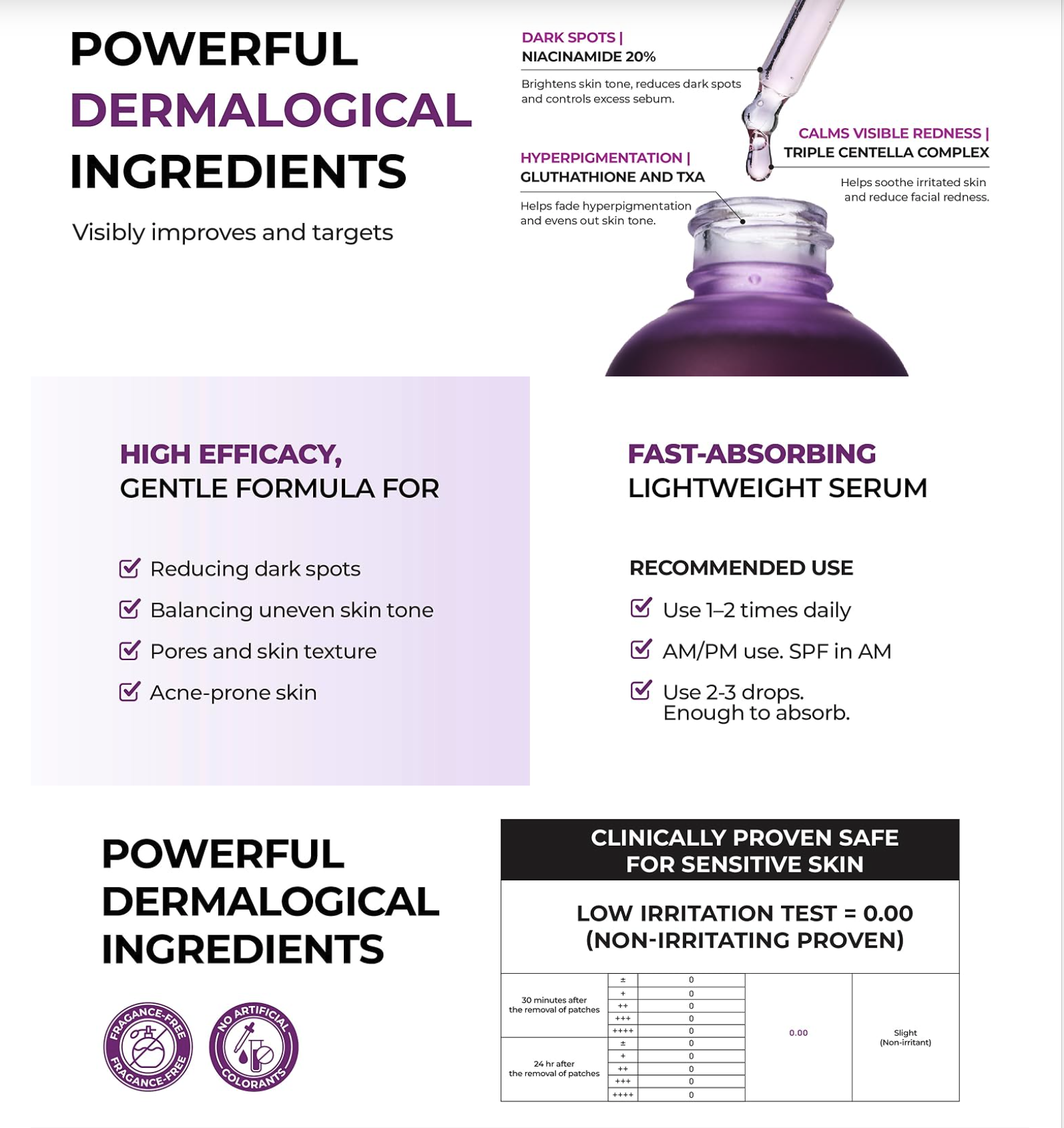 With 20% niacinamide, this potent serum is designed to dramatically brighten dull skin, refine pores, and visibly improve skin texture while supporting the barrier.