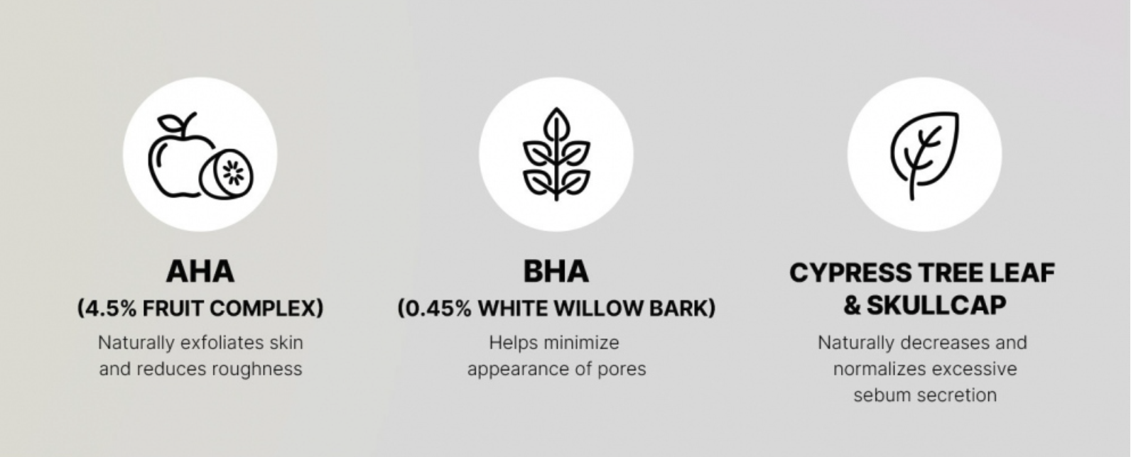 Water; Methylpropanediol; Tromethamine; Lactic Acid; Alcohol Denat.; 1,2‑Hexanediol; Panthenol; Glycereth‑26; Salicylic Acid; Ammonium Acryloyldimethyltaurate/VP Copolymer; Betaine; Trehalose; Polyglyceryl‑10 Laurate; Ethylhexylglycerin; Glycerin; Allantoin; Polyglyceryl‑10 Myristate; Disodium EDTA; Butylene Glycol; Sodium Hyaluronate; Betaine Salicylate; Citrus Aurantium Dulcis (Orange) Peel Oil; Citrus Limon (Lemon) Peel Oil; Citrus Grandis (Grapefruit) Peel Oil; Citrus Aurantium Bergamia (Bergamot) Fruit Oil; Rosmarinus Officinalis (Rosemary) Leaf Oil; Eucalyptus Globulus Leaf Oil; Lavandula Angustifolia (Lavender) Oil; Vitis Vinifera (Grape) Fruit Extract; Citrus Aurantifolia (Lime) Fruit Extract; Citrus Limon (Lemon) Fruit Extract; Pyrus Malus (Apple) Fruit Extract; Citrus Aurantium Dulcis (Orange) Fruit Extract; Centella Asiatica Extract; Salix Alba (Willow) Bark Extract; Origanum Vulgare Leaf Extract; Chamaecyparis Obtusa Leaf Extract; Lactobacillus/Soybean Ferment Extract; Cinnamomum Cassia Bark Extract; Scutellaria Baicalensis Root Extract; Portulaca Oleracea Extract; Oenothera Biennis (Evening Primrose) Flower Extract; Pinus Palustris Leaf Extract; Ulmus Davidiana Root Extract; Pueraria Lobata Root Extract; Limonene