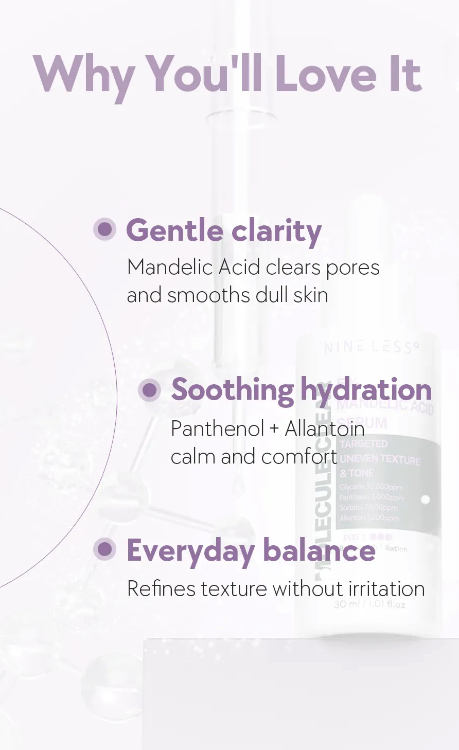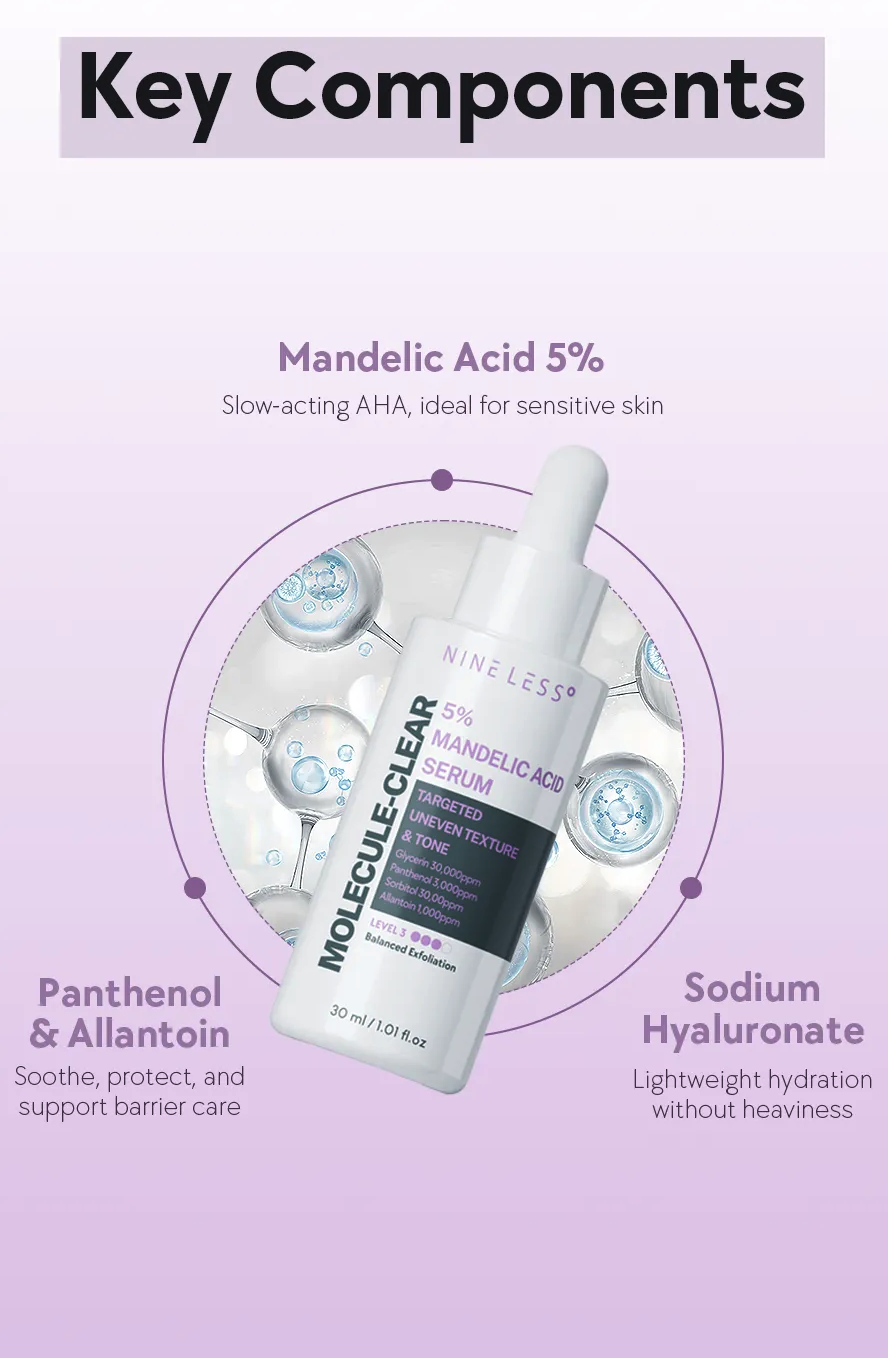 Light exfoliating serum with 5% mandelic acid that refines texture, helps fade marks, and smooths skin—while being gentle enough for sensitive types.
