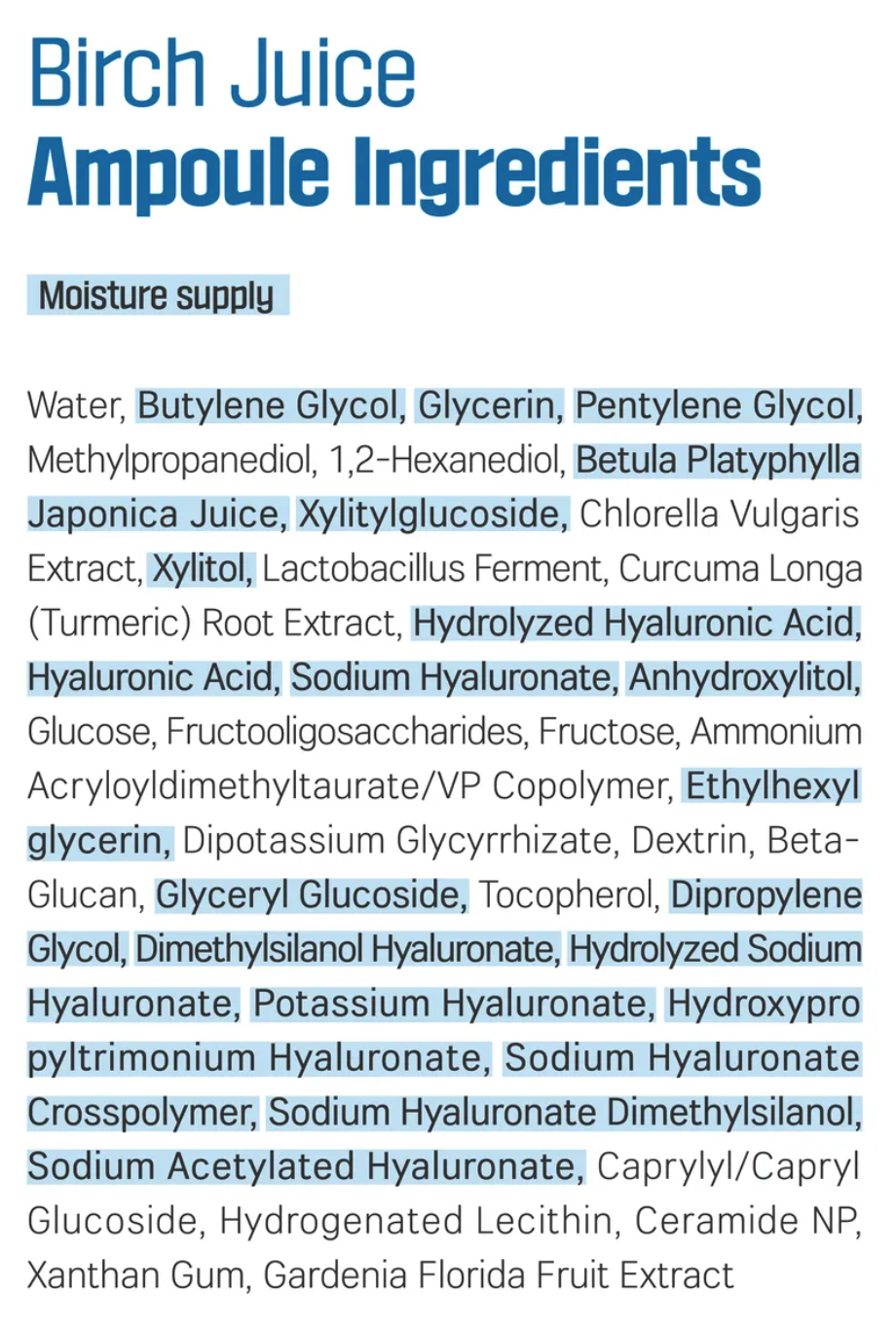 Water; Butylene Glycol; Glycerin; Pentylene Glycol; Methylpropanediol; 1,2‑Hexanediol; Betula Platyphylla Japonica Juice; Xylitylglucoside; Chlorella Vulgaris Extract; Xylitol; Lactobacillus Ferment; Curcuma Longa Root Extract; Hydrolyzed Hyaluronic Acid; Hyaluronic Acid; Sodium Hyaluronate; Anhydroxylitol; Glucose; Fructooligosaccharide; Fructose; Ammonium Acryloyldimethyltaurate/VP Copolymer; Ethylhexylglycerin; Dipotassium Glycyrrhizate; Dextrin; Beta‑Glucan; Glyceryl Glucoside; Tocopherol; Dipropylene Glycol; Dimethylsilanol Hyaluronate; Hydrolyzed Sodium Hyaluronate; Potassium Hyaluronate; Hydroxypropyltrimonium Hyaluronate; Sodium Hyaluronate Crosspolymer; Sodium Hyaluronate Dimethylsilanol; Sodium Acetylated Hyaluronate; Caprylyl/Capryl Glucoside; Hydrogenated Lecithin; Ceramide NP; Xanthan Gum; Gardenia Florida Fruit Extract